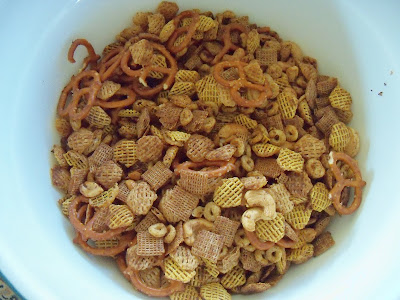 I spent the day making Chex Mix.....3 batches of it.....one without nuts for the allergic Grayson.....and we're talking a serious life-threatening allergy to peanuts. The Chex Mix below was made after I made the nut free and had it all packaged up. I wouldn't even get the nuts out of the cupboard before that!